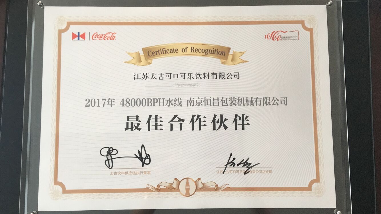南京恒昌包裝作為后段整包商,在江蘇太古可口可樂48000bph水線項(xiàng)目中獲得“最佳合作伙伴”殊榮!